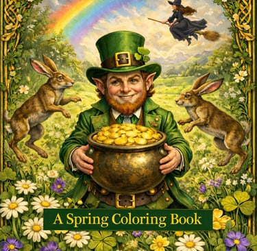 Dive into whimsical folklore this March! 30+ enchanting pages of mischievous leprechauns, swift hares, and mysterious witches amid blooming Spring scenes.