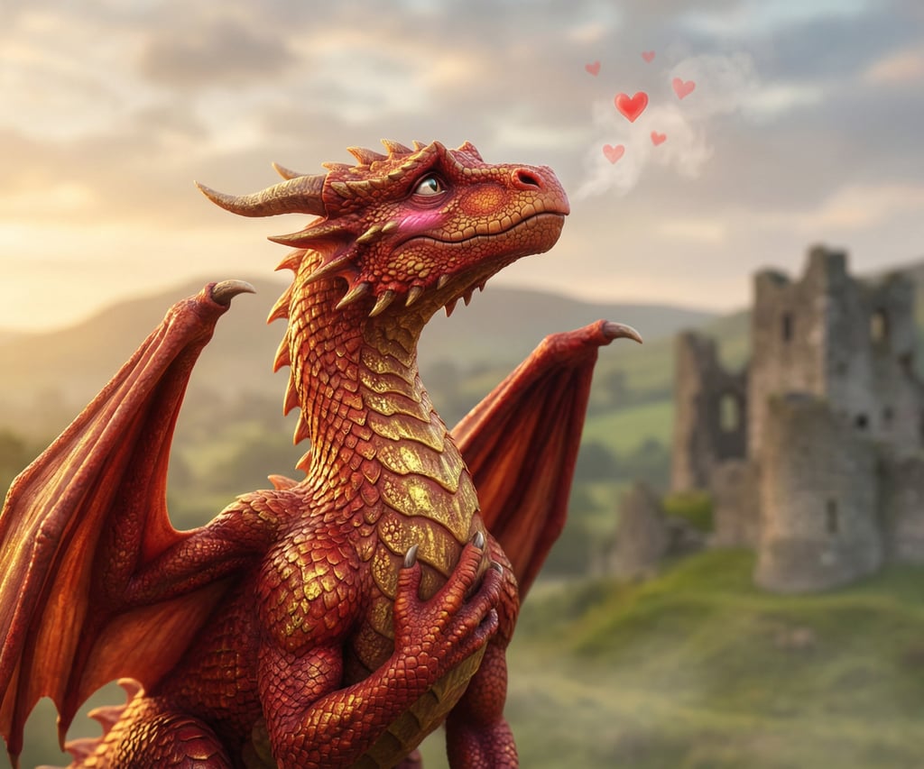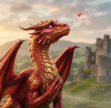 And let's not forget my own Welsh lovesick dragon, who's currently perched amid the misty ruins, gazing dreamily and puffing little heart-shaped clouds into the sky... because even dragons catch feelings on a day like this! 🏴🐲